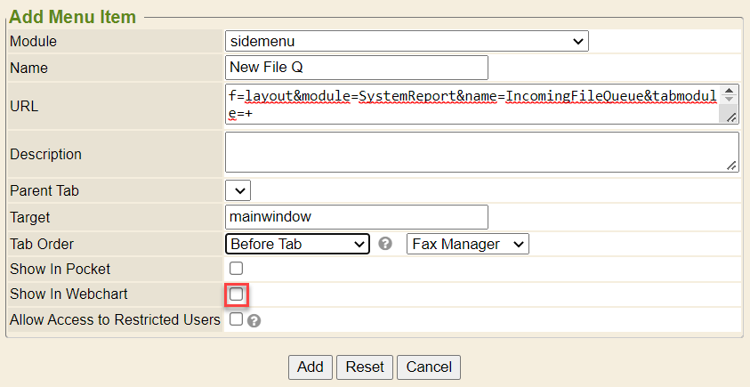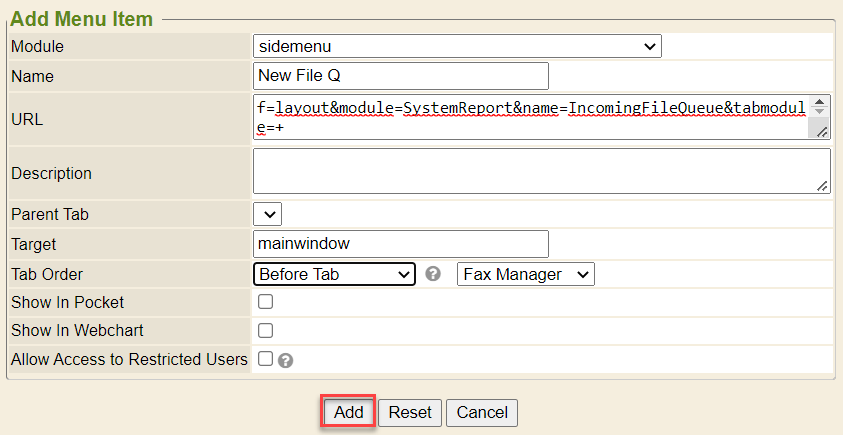 - Add the URL - ?f=layout&module=SystemReport&name=IncomingFileQueue&tabmodule=+