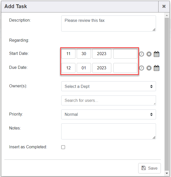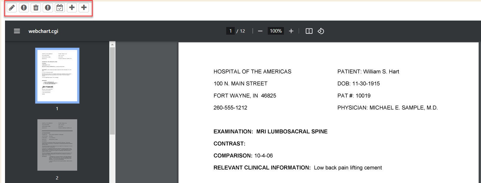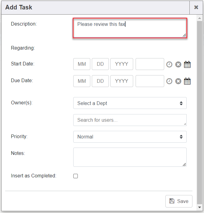 The File/Fax Queue allows for viewing/indexing of incoming faxes. Within the module, a file can be previewed or opened, tasks generated, file sent to a new user or department, or indexed directly within the queue or WebScan. This module has recently been updated to now include additional information when opening the file. When a user opens the file, they will see a summary of that document. The summary includes the File ID, Date and Time it was created in the queue, the Sender’s fax number, and the status. When a user hovers over this information, a set of shortcut icons are displayed. The icons will be reviewed in the Documentation section. The File/Fax Queue is a feature that can be added or upgraded for an additional cost.