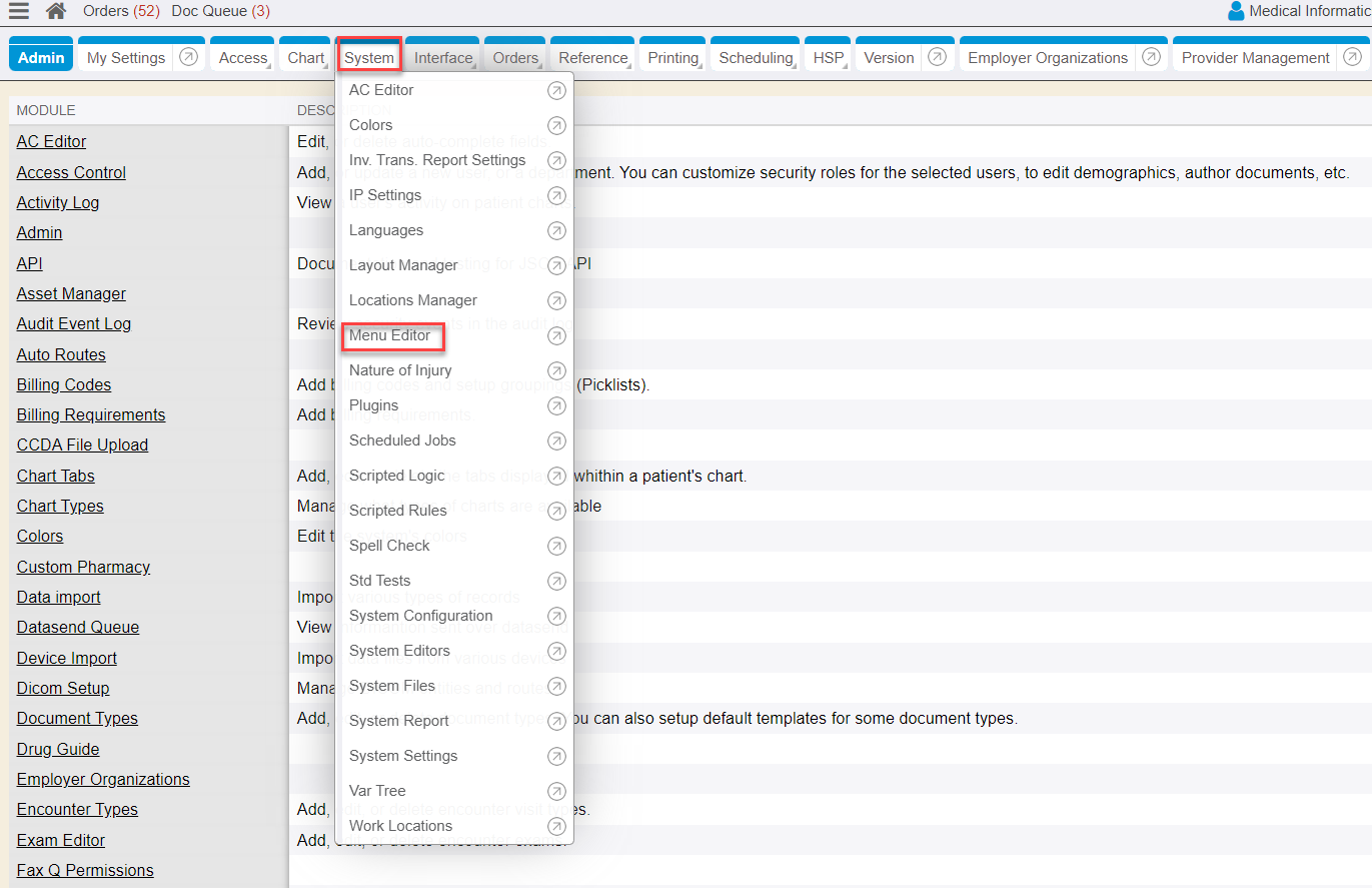 - From the Control Panel on the left side menu, click on the System chart tab and then click on the Menu Editor sub-tab