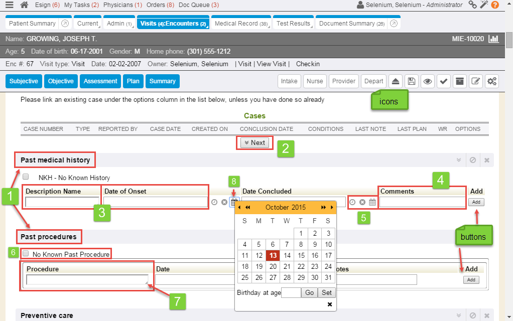 5. Note complete button: Used for taking a note on a patient; saves and closes the note.